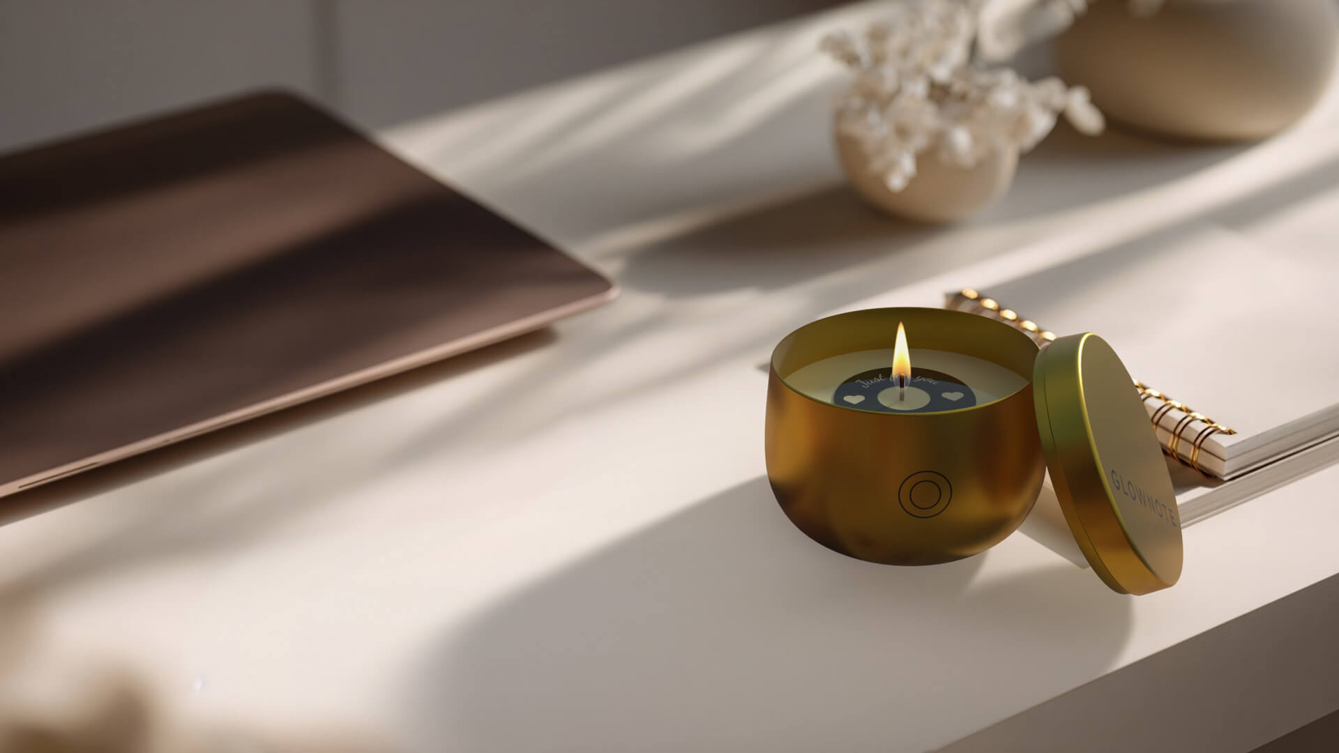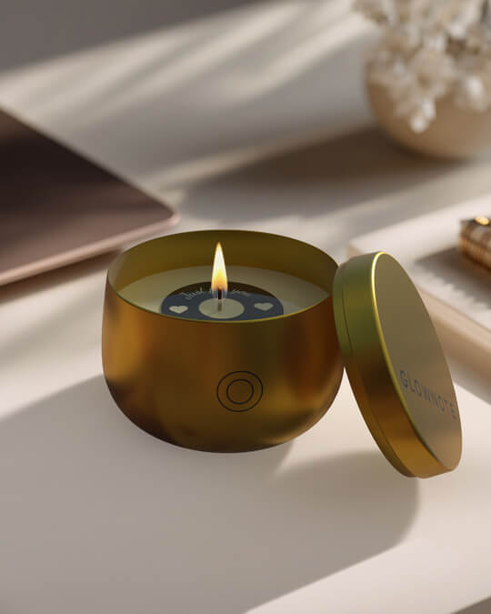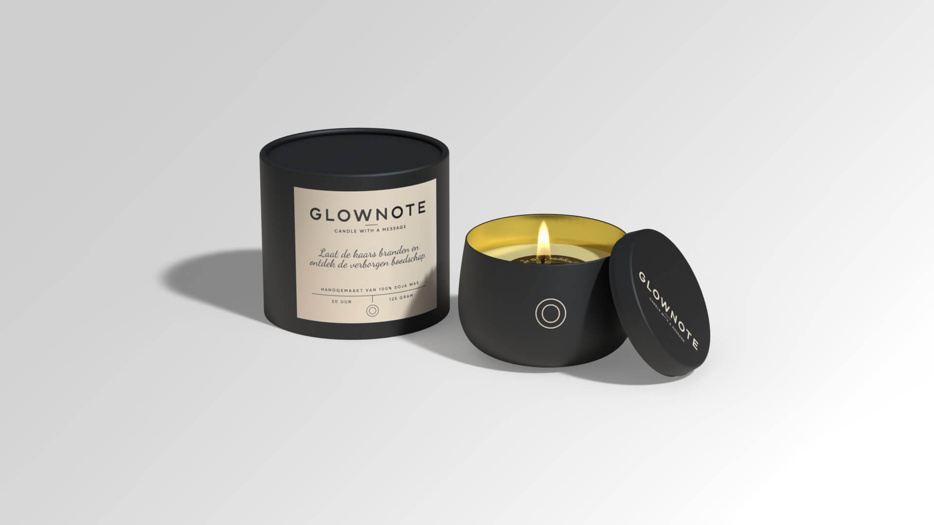 Elke GlowNote zit in een mat metalen blikje en wordt verpakt in een stevige koker. Minimalistisch van buiten, persoonlijk van binnen.